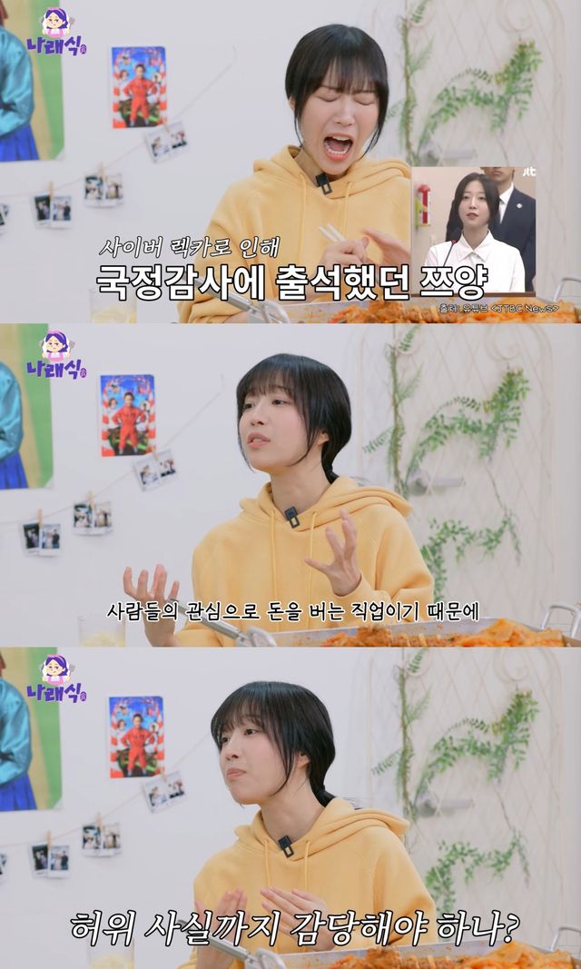 이날 박나래는 최근 국정감사에 출석했던 쯔양을 언급하며 "사이버렉카 때문에 간 거 봤다. 악플을 떠나 가짜뉴스는 진짜"라며 한숨을 내쉬었다.