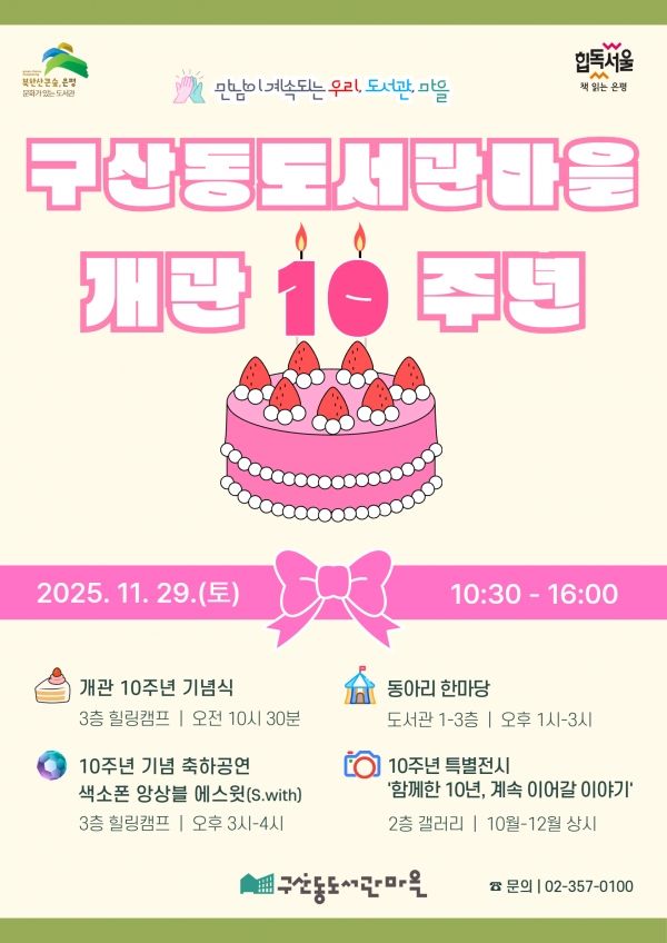 구산동도서관마을 10주년 기념행사는 도서관 전 공간에서 진행되며, 누구나 무료로 참여할 수 있다. 자세한 사항은 구산동도서관마을 전화(02-357-0100, 내선 3) 또는 누리집(www.gsvlib.or.kr)을 참고하면 된다.