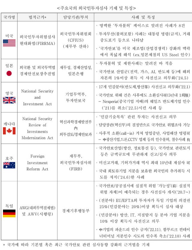 실제 주요 국에선 외국인투자 관할 법률을 개정하거나 추가 입법을 통해 기존 ‘국가이익’ 관점에서 심사하던 외국인투자 심사기준에 ‘국가안보’를 추가하거나 비중을 높이고 있다. 영국 및 캐나다 등 일부 국가는 이미 허가한 심사라 하더라도, 국가안보상 긴급하고 중대한 경우에는 재심사를 통해 지분매각 등 강력한 조치를 취할 수 있도록 제도를 마련한 바 있다. 미국은 외국인투자심의위원회(CFIUS)를 재무부 장관 주재의 정부 내 협업 조직으로 꾸리고, 영국도 투자안보국(ISU)을 내각부와 총리실 산하로 운영하고 있다.