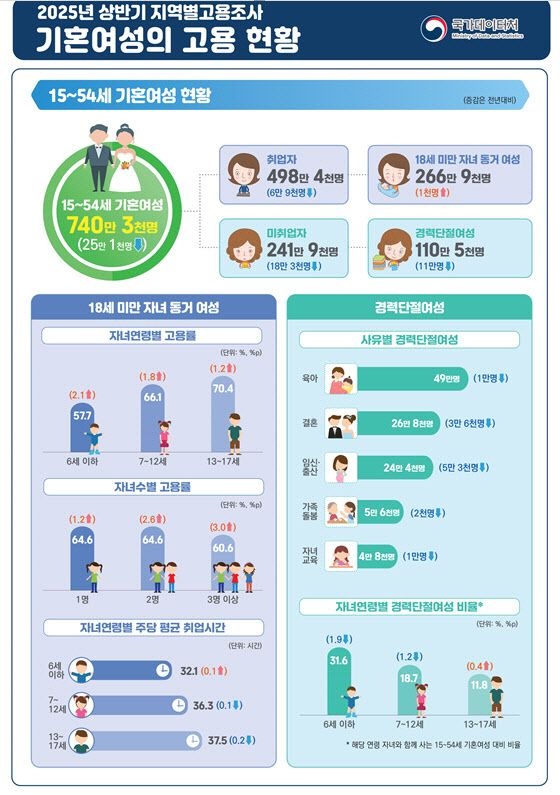 국가데이터처가 20일 발표한 ‘2025년 상반기 지역별 고용조사 기혼여성의 고용 현황’에 따르면 기혼여성 중 취업자는 498만 4000명, 18세 미만 자녀와 동거하는 기혼여성 중 취업자는 266만 9000명으로 집계됐다. 특히 18세 미만 자녀와 동거하는 기혼여성의 고용률은 64.3%로 전년 대비 1.9%포인트 상승하며 2016년 통계 작성이래 역대 최고치를 기록했다.