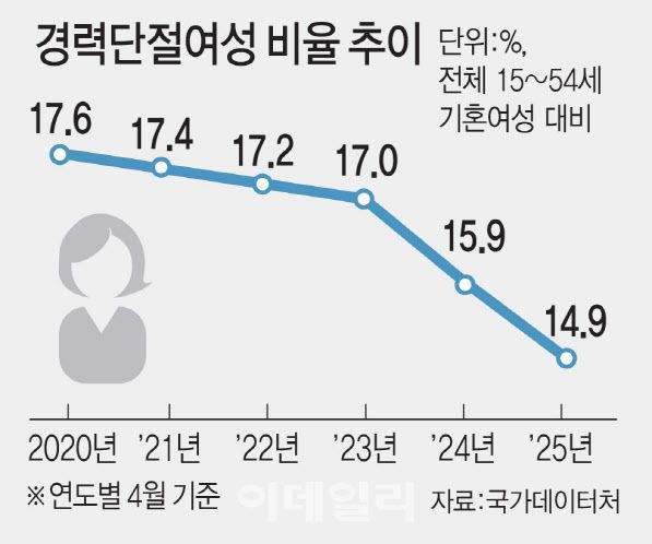 데이터처 관계자는 “결혼·출산 연령 상승으로 기혼여성 자체 규모가 줄기도 했지만, 무상보육, 늘봄학교 확대, 영유아 보육시설 연장 운영 등 돌봄정책 확대가 고용률 상승과 경단녀 감소에 영향을 준 것으로 보인다”고 했다.