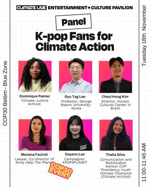 뉴시스 보도에 따르면, 20일 K-팝 팬들이 주도하는 기후 캠페인 플랫폼 케이팝포플래닛에 따르면, 지난 18일(현지시간) COP30 본회의장 '블루존'에서 주브라질한국문화원 주최로 '케이팝 팬들의 기후행동' 패널 토론이 열렸다.