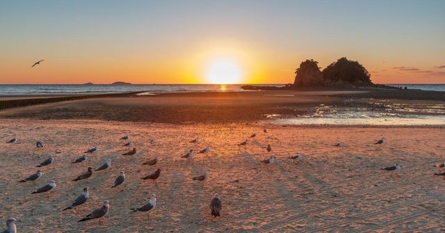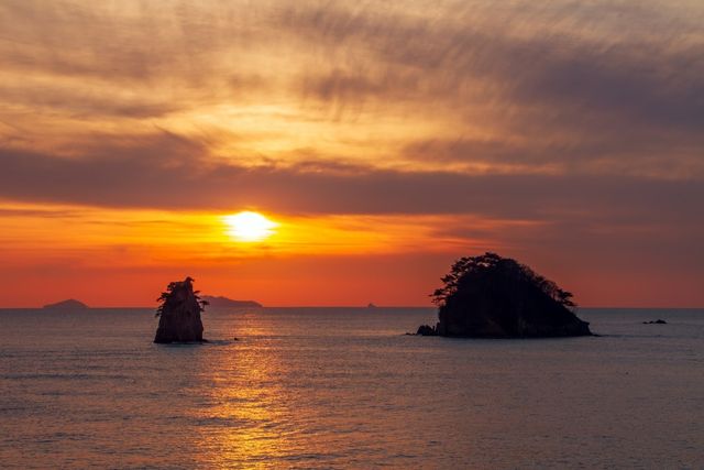 해변 앞에 우뚝 솟은 두 개의 바위섬이 해수욕장의 상징이자 인기 포토존으로 꼽힌다. 특히 바위들 사이로 해가 지는 풍경은 서해안 3대 낙조로 꼽힐 만큼 환상적이다.