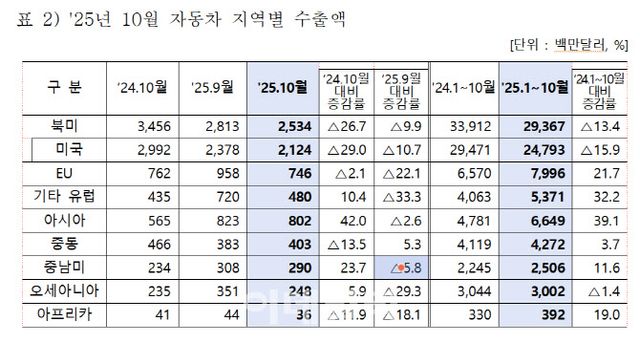 한국의 최대 자동차 수출 시장인 미국으로의 수출은 작년 10월보다 29.0% 감소한 21억 2000만달러를 기록했다. 대미 자동차 수출은 미국 트럼프 행정부가 지난 4월부터 모든 수입차에 25% 품목 관세를 부과한 영향 등으로 8개월 연속 감소세다.
