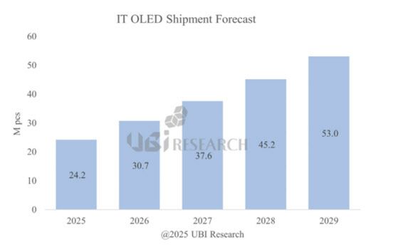 시장조사업체 유비리서치에 따르면 글로벌 IT용 OLED 출하량은 올해 2400만대에서 2029년 5300만대까지 증가할 것으로 전망됐다.