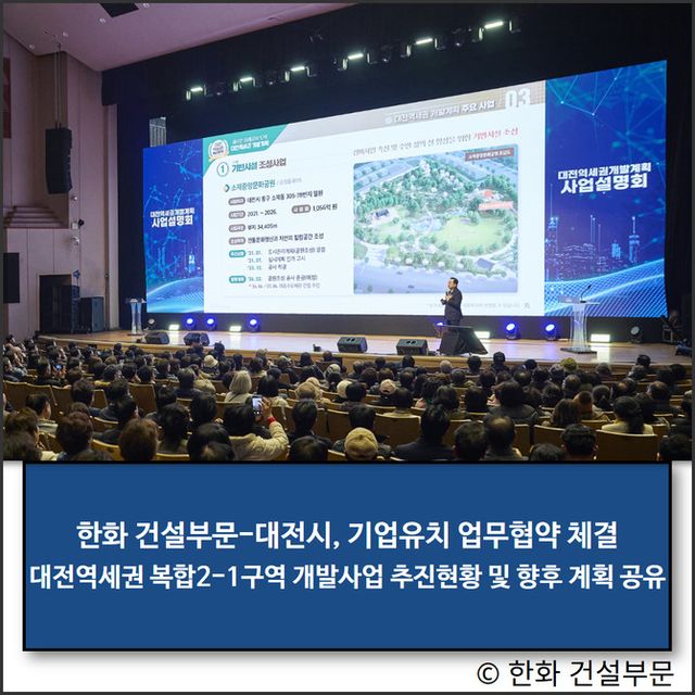 한화(000880) 건설부문과 대전시가 대전역세권 복합2-1구역성공 개발을 위해 공동사업설명회를 개최하고 기업유치 업무협약(MOU)을 체결하는 등 협력관계를 강화했다.