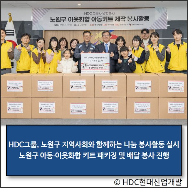 HDC그룹 임직원들은 직접 아동 정서 지원 물품과 생활용품, 응원 메시지가 담긴 키트를 정성껏 포장하고 노원구 관내 아동복지시설 아동 200여명에게 전달했다. 이웃화합 아동키트는 층간소음 예방 물품, 학용품, 영양제, 도서 등으로 구성됐으며 이웃 간 따뜻한 연결과 정서적 지지를 담았다는 점에서 의미를 더했다.