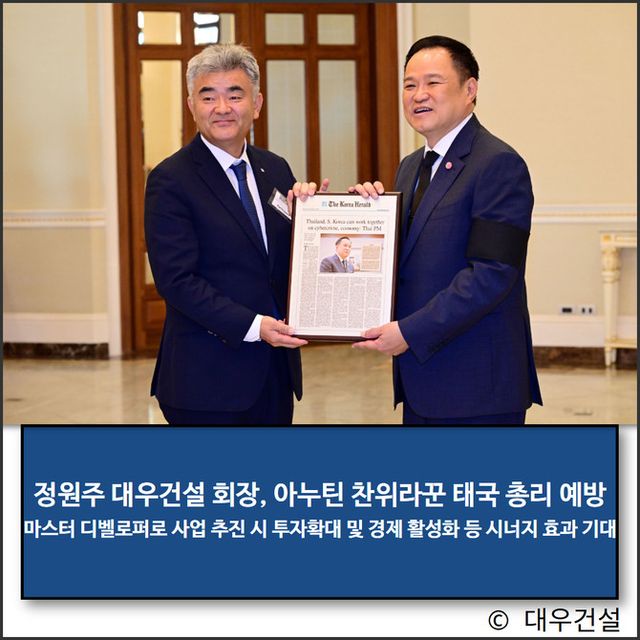 이날 예방에서 정 회장은 "대우건설의 52년 건설 노하우와 최근 베트남에서의 성공적인 부동산 개발사업 경험을 바탕으로 태국에서도 현지업체와 긴밀하게 협력하며 디벨로퍼로 적극적인 역할을 희망한다"며 "한류에 기반한 다양한 산업을 개발사업에 접목시킨 K시티를 조성해 관련 한국 업체의 투자 확대 및 경제 활성화라는 시너지 효과를 만들어내고자 한다"고 말했다.