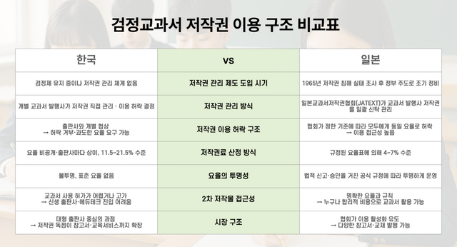 최 교수는 일본 사례를 들며 "한국은 개별 출판사에 저작권이 집중돼 시장 왜곡이 심각한 반면, 일본은 국가가 이용료를 표준화해 누구나 합리적인 비용으로 교과서를 활용할 수 있게 만들었다"고 평가했다.
