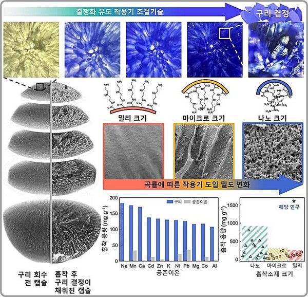 연구팀은 "높은 흡수력을 위해선 구리 이온이 캡슐 내부로 들어와 머무르고 자랄 수 있는 공간이 필요하다"며 "쌀알 크기 캡슐 내부에 3차원 방사형 구조를 다층적으로 배치, 구리 이온이 빠르게 흡착된 뒤 캡슐 안에서 구리 결정으로 성장하도록 유도했다"고 설명했다.
