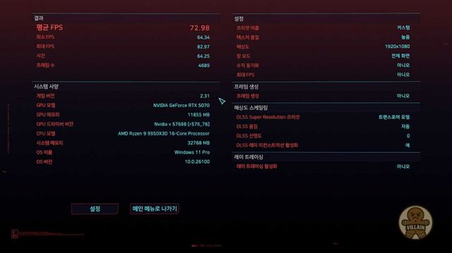▲ 프레임 생성 미적용 시에는 72.98프레임이다. 일단 60프레임은 넘기긴 했는데 좀 아쉽다.