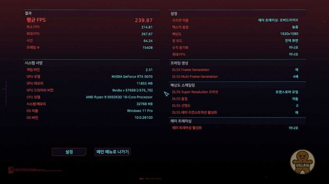 ▲ RTX 5070 DLSS 품질, 프레임 생성 4x 결과. 아예 급이 달라진다. 이 정도면 360Hz 모니터에서도 쾌적하게 즐길 수 있다.