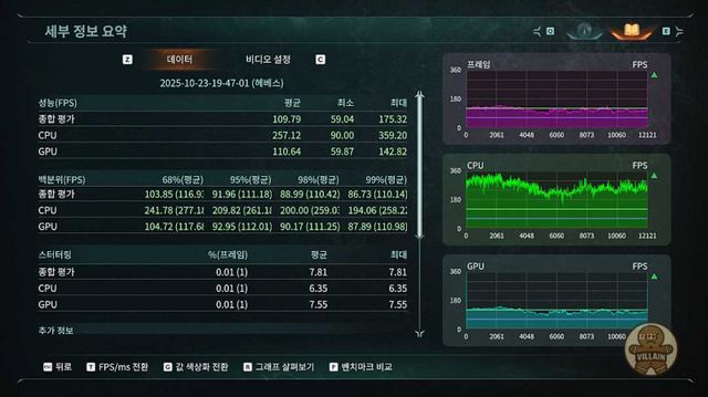 ▲ RTX 5070 DLSS 미적용(TAA) 결과. 평균 109.79프레임으로 풀옵션에서 100프레임을 넘긴다. 최소 프레임은 59.04프레임이다.