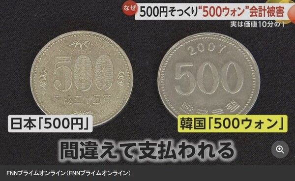 뉴시스 보도에 따르면, 20일 일본 FNN프라임온라인에 따르면 도쿄 신주쿠구 신오쿠보의 우동집 '이요지' 주인 이토 다카시(69) 씨는 "500엔과 500원은 크기와 무게가 같아서 손님이 놓고 가면 바로 확인하기 어렵다"며 최근에도 비슷한 피해가 발생했다고 밝혔다.