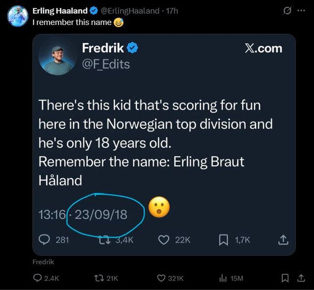 당시 그는 "노르웨이 1부 리그에서 즐겁게 골을 넣는 18세 소년이 있다. 이름을 기억하라: 엘링 브라우트 홀란"라고 적으며, 젊은 선수의 미래를 예견했다.