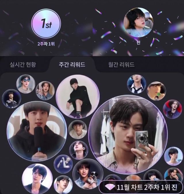 팬들이 직접 이미지를 등록해 좋아요 순으로 노출되는 ‘최애 PICK’ 보상 콘텐츠에서도 활동이 활발히 이어지고 있다. 포도알 차트 내에서 진의 존재감은 명확했다는 평가가 나온다.