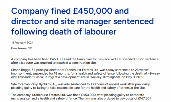 판례에서도 이러한 원칙이 반복적으로 확인된다. 대표적으로 2016년 모나본 컨스트럭션(Monavon Construction)은 공사장 펜스가 도심 보도로 넘어가며 행인이 사망한 사건에서 기업살인죄가 인정돼 약 55만 파운드의 벌금을 선고받았다. 또한 2024년 스톤허스트 에스테이츠(Stonehurst Estates)는 불안정하게 설치된 구조물이 무너져 노동자가 숨진 사고 이후 45만 파운드의 벌금과 추가 비용을 부과받았다.