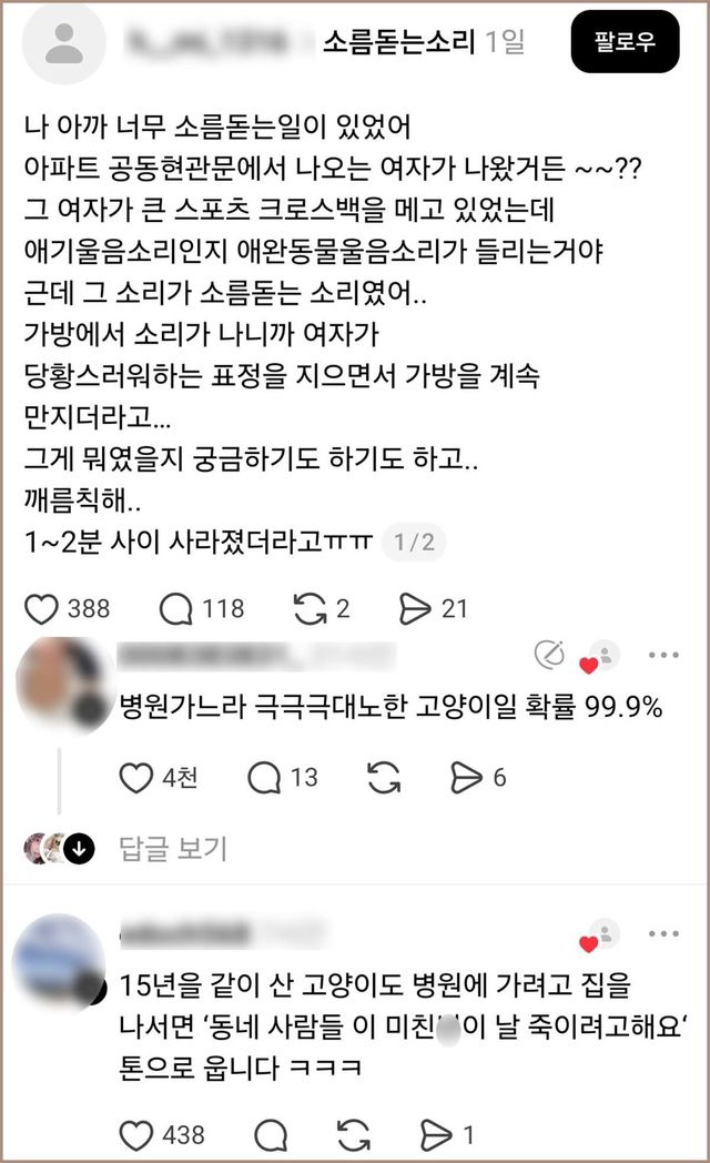 이 같은 고양이의 특성을 모르는 사람이라면 작성자처럼 소름 끼치는 경험을 할 수도 있다. 특히 큰 가방에서 나는 묘한 울음소리는 더욱 그렇다. 하지만 고양이 보호자들에게는 익숙한 일상이다.