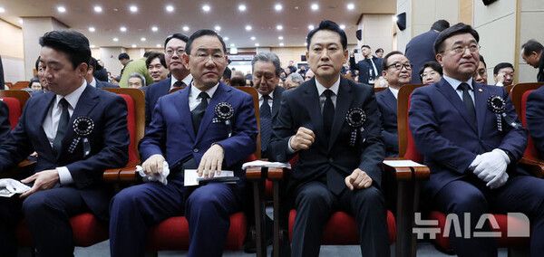 송언석 국민의힘 원내대표는 이날 추모식에 참석하지는 않았지만 국회에서 열린 원내대책회의에서 "김 전 대통령은 민주주의에 대한 불굴의 신념과 투쟁으로 권위주의 체제를 청산하고 이 땅에 민주주의 시대를 활짝 열었다"며 "(그런데) 지금 우리는 독재와 불의에 맞섰던 신념과 용기가 필요한 시대를 다시 맞이하고 있다"고 했다.