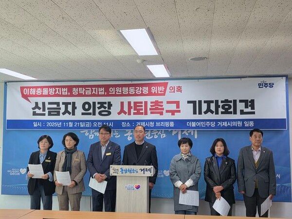 경남 거제시의회 더불어민주당 소속 시의원 7명이 21일 거제시청 브리핑룸에서 기자회견을 열고 이해충돌방지법·청탁금지법·의원행동강령 위반 의혹이 제기된 신금자 의장의 사퇴를 촉구했다.