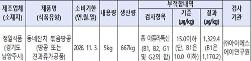 식품의약품안전처(처장 오유경)는 식품제조·가공업체인 ‘정일식품(경기도 남양주시 소재)’이 제조·판매한 ‘동네잔치 볶음땅콩(식품유형 : 땅콩 또는 견과류가공품)’에서 아플라톡신이 기준치보다 초과 검출되어 해당 제품을 판매 중단하고 회수 조치한다고 밝혔다.