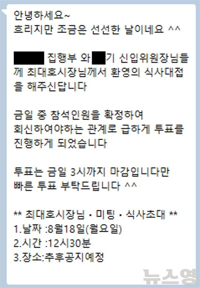 음 의원은 해당 단체 모임 식사비 결제 건과 관련해 모임 단톡방에 최 시장의 환영 식사대접을 알리는 문자가 공지됐고, 최 시장 비서실 직원이 식당도 예약했다고 지적했다.