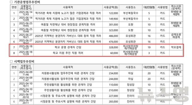 음 의원은 해당 식사비가 기관운영업무추진비로 결제됐다며 "민간단체에 기관운영업무추진비 사용은 용도에 맞지 않는 법인카드 사용이며, 공직선거법 위반과 별개로 시민의 혈세 낭비"라고 비판했다.