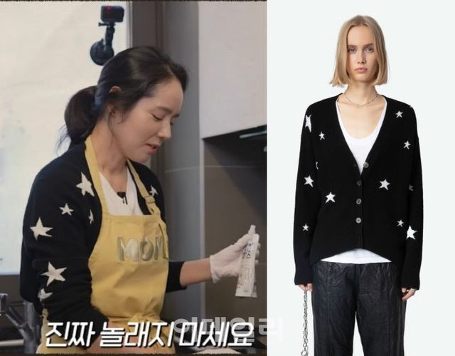 이번 가디건 외에도 한가인은 자연스럽게 가디건을 착용해 온라인상에서 관심을 받았다. 남편 연정훈을 위한 생일상을 차려주는 에피소드에서는 블랙 가디건에 별이 박힌 가디건을 착용했는데, 편안해 보이면서도 외출복으로도 활용할 수 있는 룩으로 주목 받았다. 이 제품은 프랑스 컨템퍼러리 브랜드 ‘쟈딕 앤 볼테르’의 ‘미르카 캐시미어 가디건(Mirka Stars Cashmere Cardigan)’으로 가격은 100만원대다.
