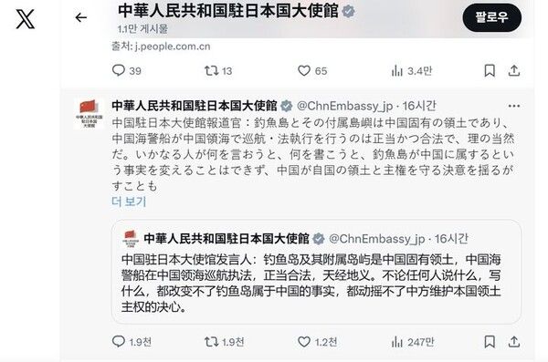 뉴시스 보도에 따르면, 일본 매체 닛칸스포츠에 따르면 주일 중국대사관은 21일 저녁 공식 X(엑스·옛 트위터)에 센카쿠열도에 대해 일본어로 "중국 주일대사관 대변인: 댜오위다오와 그 부속 도서는 중국 고유의 영토이며, 중국 해경선이 중국 영해에서 항행·법 집행을 하는 것은 정당하고 합법적이며, 너무도 당연한 일이다"라고 썼다.