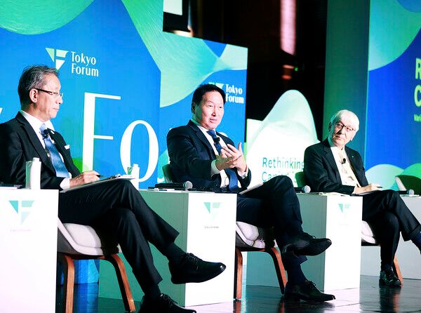 최태원 SK그룹 회장(왼쪽)이 21일 일본 도쿄대 야스다 강당에서 열린 '도쿄포럼 2025'의 비즈니스 리더 세션에 참석해 토론하고 있다. 오른쪽은 이와이 무츠오 일본경제동우회 회장 대행 겸 일본담배산업 이사회 의장 /SK 제공