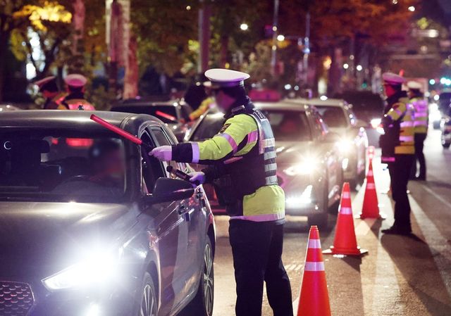 경찰이 지난 21일 서울 시내에서 음주운전 단속을 실시하고 있다. 서울경찰청은 금요일인 지난 21일 오후 9시부터 오후 11시까지 2시간 동안 서울 강남역·공덕역·영등포역·잠실새내역 등 서울 시내 중심가를 중심으로 진행된 음주단속에서 면허정지 수준의 음주운전 3건을 적발했다고 22일 밝혔다. / 연합뉴스