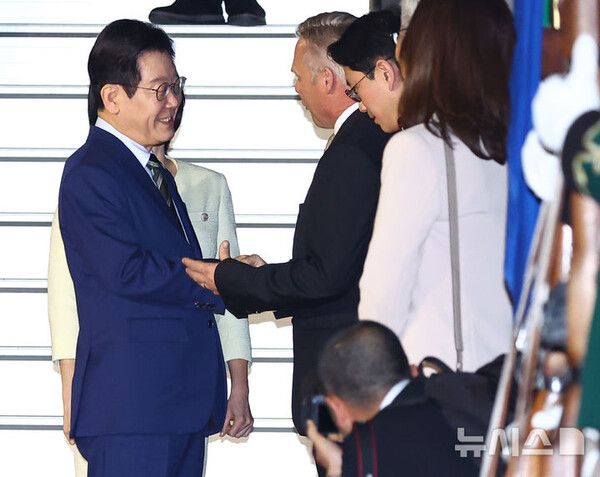 뉴시스 보도에 따르면, 이 대통령은 현지시간으로 22일 오전 10시께 올해 G20 정상회의가 열리는 남아공 요하네스버그 엑스포센터에 도착했다. 시릴 라마포사 남아공 대통령이 이 대통령을 맞이했다. 이 대통령은 밝은 회색 정장에 은색·빨간색·파란색이 배색된 넥타이를 착용했다.