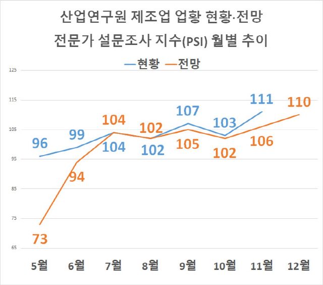 산업연구원은 이달 10~14일 전문가 120명에게 업황 현황 및 전망을 물은 결과 11월 업황 현황 전문가 설문조사지수(PSI)는 ‘111’로 전월(103) 대비 8포인트 올랐다고 23일 밝혔다. 전월대비 2개월 연속 상승한 것으로, 절대 수치도 지난해 7월 ‘113’을 기록한 이후 16개월 만에 가장 높았다.