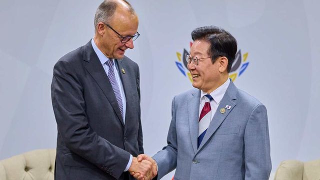 이재명 대통령과 프리드리히 메르츠 독일 총리가 22일(현지 시각) 남아프리카공화국 요하네스버그 나스렉 엑스포센터에서 열린 정상회담에서 악수하고 있다. / 연합뉴스