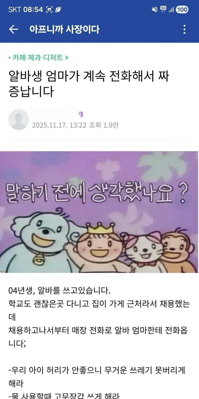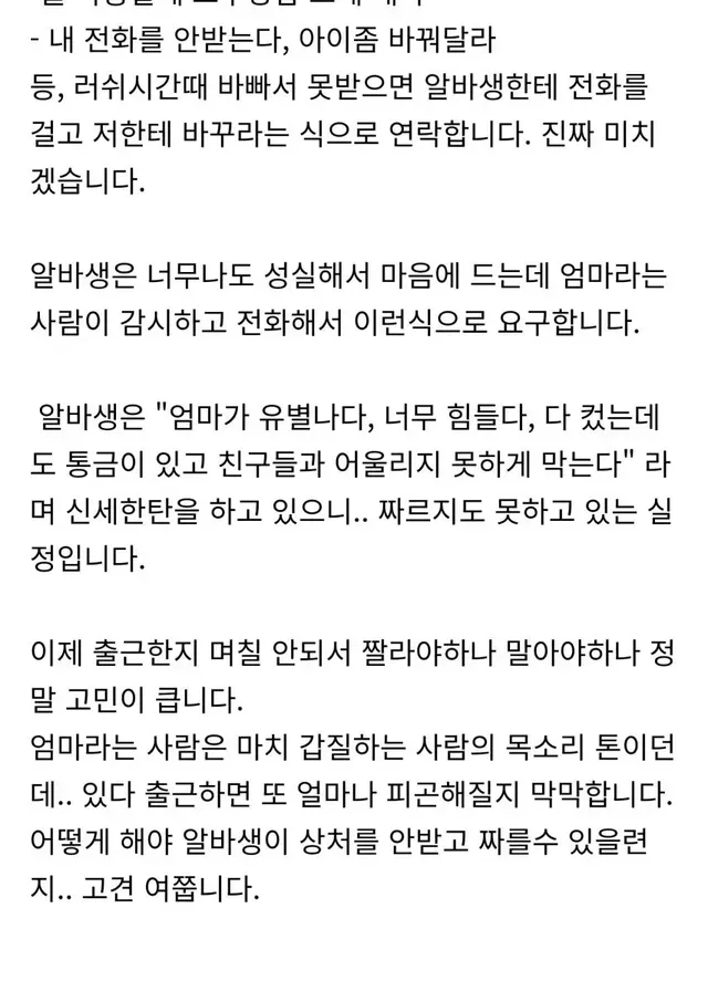 알바생 엄마한테 전화가 계속 와서 괴로운 사장님,,