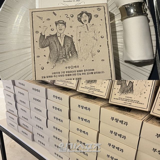 호두과자 박스 겉면에는 “사랑으로 구운 부창제과의 달콤한 호두과자에 오늘 함께해 주신 따뜻한 마음에 대한 진심 어린 감사를 담았습니다”라는 문구가 담겨 있다. 여기에 이장우·조혜원 부부의 환한 미소가 드로잉 형태로 새겨져 있어 하객들의 시선을 더욱 끌었다.