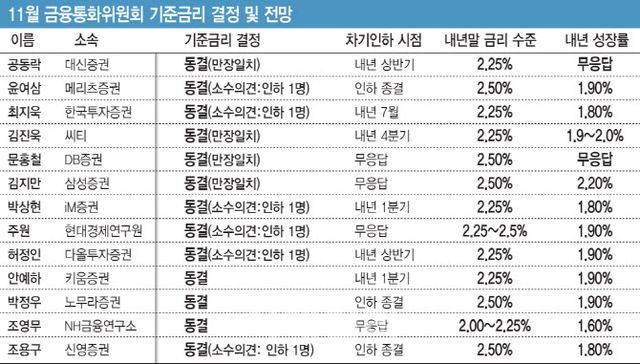 내년 성장률 전망치가 상향될 것으로 예상되며 내년 기준금리 인하도 많아야 1회가 될 것이라는 의견이 다수를 이루고 있다. 다만 인하 시점에 대한 의견은 상반기와 하반기로 엇갈린다. 주목할 것은 연내 동결이 유지될 것으로 보는 전문가들도 13명 중 6명에 달한다는 점이다.
