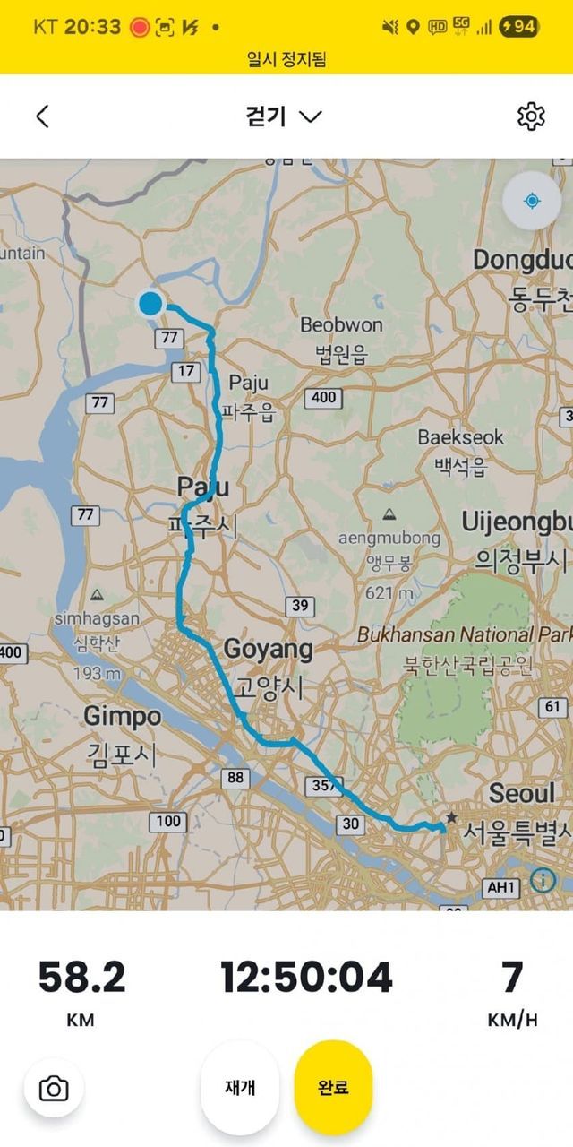 순수이동시간으로 12시간 50분, 총이동시간 16시간 20분, 이동거리 58.1km, 도보수 83038보(답사때는 한 8만보정도)를 끝으로 경의선 도보로 완주에 성공했음.