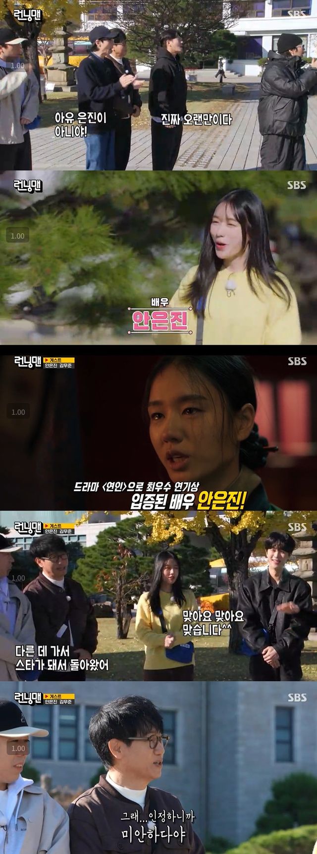 유재석은 "(안은진이) 스타가 됐다"며 운을 뗐고, 지석진은 "은진이는 런닝맨에서 키웠는데 다른 데 가서 스타가 되어 돌아왔다"라고 이야기했다.