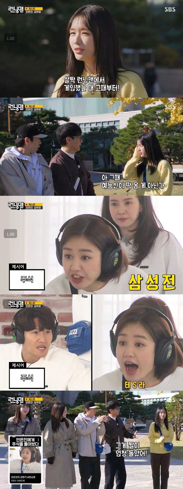 안은진은 "(과거) '런닝맨'에서 게임했을 때 그때 딱 예능신이 온 게 아닌가 싶다"며 자신의 활약을 되짚었다. 당시 안은진은 고요 속의 외침 게임에서 삼성전자와 테슬라를 외치며 주식을 설명해 큰 화제가 됐다.