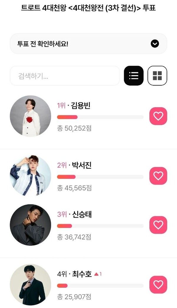뉴시스 보도에 따르면, 김용빈은 24일 오전 8시 기준 팬덤 플랫폼 스타덤(STARDOM) 트로트 4대천왕 3차 결선 '4대천왕전'에서 5만252점으로 1위를 유지했다. 2위 박서진(4만5565점)과 약 5000점 차로, 점점 격차를 벌리고 있는 상태다. 두 사람은 TV조선 '미스터트롯3'와 MBN '현역가왕2' 우승자로 자존심 대결을 벌이고 있다. 김용빈은 1차 예선 6위, 2차 준결선 5위에 그쳤으나, 3차전부터 선두를 달리기 시작했다. 박서진은 1·2차에 이어 3차전도 2위를 유지했다.
