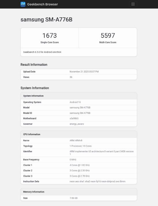 24일 IT업계에 따르면 갤럭시 A73(2022년) 이후 자취를 감췄던 후속 모델이 최근 긱벤치(Geekbench) 데이터베이스에서 포착됐다. 모델명은 SM-A776B, 시장명으로는 ‘갤럭시 A77’이 유력하다.