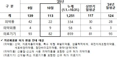 2025년 10월 의료제품 허가 품목 수는 지난해 월평균(124개) 대비 91.1% 수준이었으며, 올해 상반기 월평균(117개) 대비 96.6% 수준으로 나타났다.