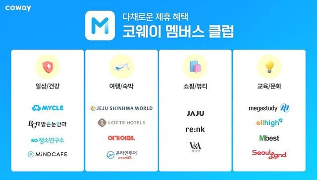 코웨이 멤버스클럽은 메가스터디, 여기어때, 롯데호텔, 제주신화월드, JAJU, 차량관리앱 마이클 등 총 13개 브랜드와 제휴를 통해 상품 할인, 무료 체험, 쿠폰 등 혜택을 제공하고 있다. 코웨이는 고객의 라이프스타일에 맞춰 제휴 파트너사를 지속 확대하고, 생활 밀착형 혜택을 중심으로 고객 편의성을 높여 나갈 예정이다.