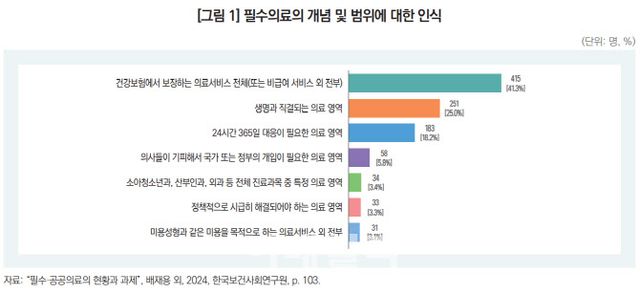 다른 하나는 건강보험을 통해 제공되는 의료서비스 전체를 필수의료의 범위로 인식하는 입장이다. 응답자의 41.3%는 필수의료를 ‘건강보험에서 보장하는 의료서비스 전체(또는 비급여 서비스 외 전부)’로 인식했다. 이는 건강보험 보장 범위를 필수의료로 보는 포괄적인 시각이다.