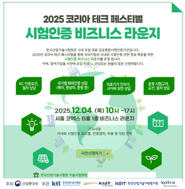 시험인증 비즈니스 라운지와 기술규제 설명회는 현재 코리아 테크 페스티벌 및 KTL 누리집을 통해 사전 신청을 받고 있다. 현장 접수도 가능하다.