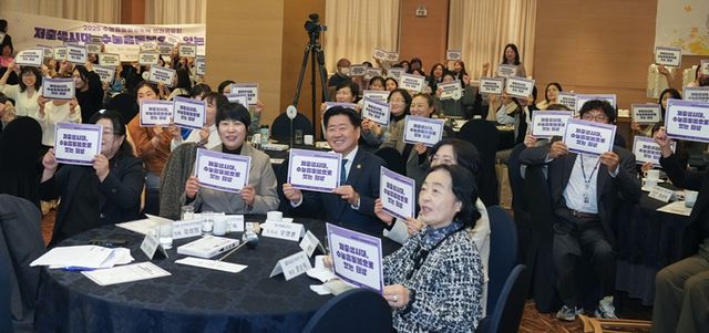 24일 열린 2025 수눌음돌봄공동체 성과 공유회에서 오영훈 지사 등 참석자들이 손팻말을 들고 기념사진을 찍고 있다. 제주도 제공