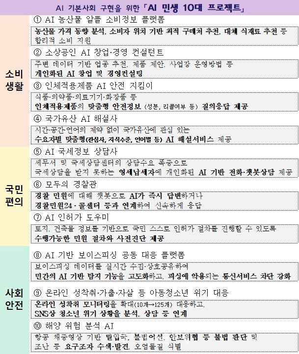 먼저 AI 민생 10대 프로젝트로 △AI 농산물 알뜰 소비정보 플랫폼 △소상공인 AI 창업·경영 컨설턴트 △인체적용제품 AI 안전 지킴이△국가유산 AI 해설사 △AI 국세정보 상담사 △모두의 경찰관 △AI 인허가 도우미 △AI 기반 보이스피싱 공동 대응 플랫폼 △온라인 성착취·가출·자살 등 아동청소년 위기 대응 △해양 위험 분석 AI가 추진된다.