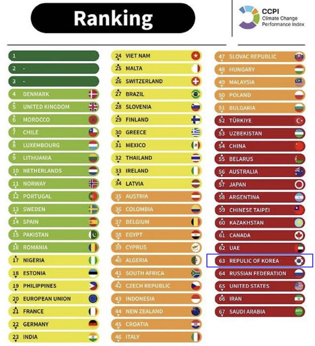 앞서 지난 18일 독일에서 발표된 ‘2026년 기후변화대응지수’(Climate Change Performance Index 2026, CCPI)에서 한국은 전체 67개 국가 중 63위로 작년과 같은 하위권을 기록했다. 우리나라보다 순위가 낮은 국가는 이란, 사우디아라비아, 러시아 등 산유국과 파리협정 탈퇴를 선언한 미국뿐이었다.