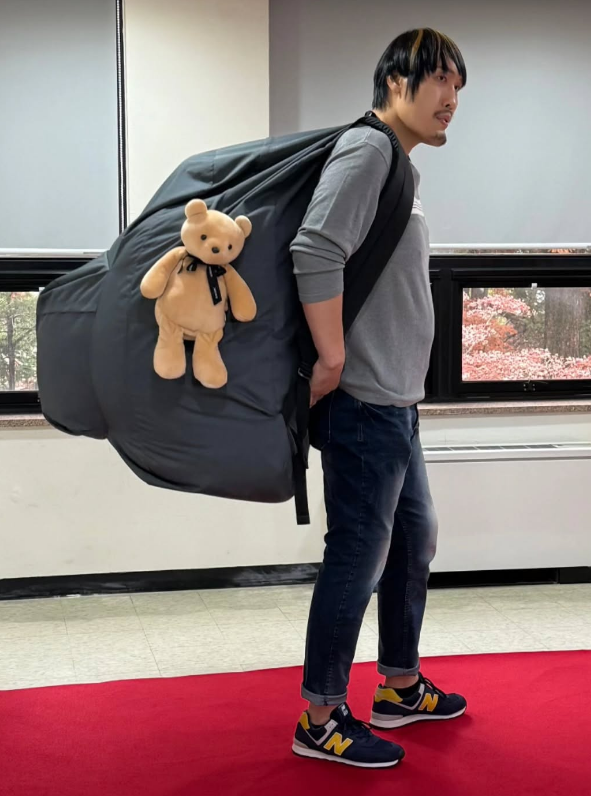신장 217cm로 알려진 그의 거구에 비해서도 한참 커다란 사이즈의 이 백팩은 그의 허리부터 머리까지 가릴 듯한 크기로, 만화 같은 비주얼을 연출한다.